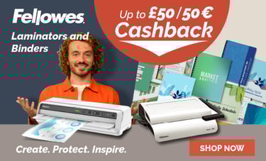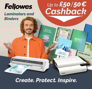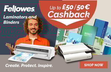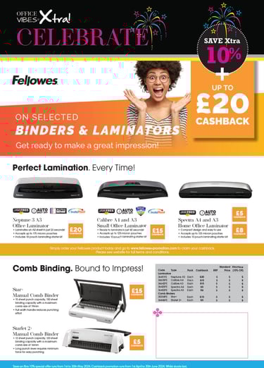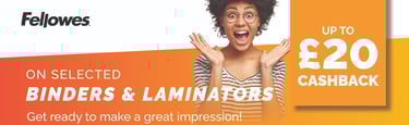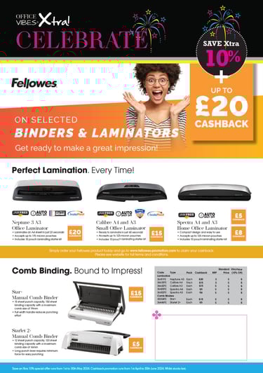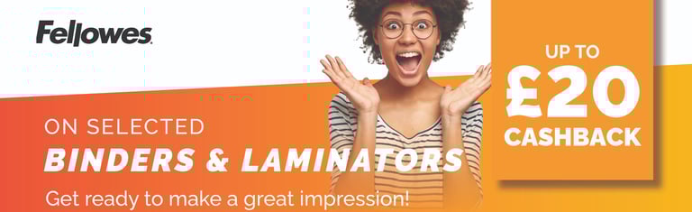 Celebrate this May with up to £20 Cashback on Fellowes Binders and Laminators plus... Save an Xtra 10%.