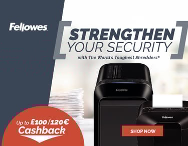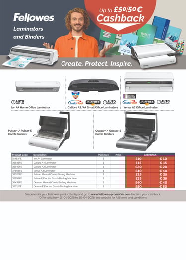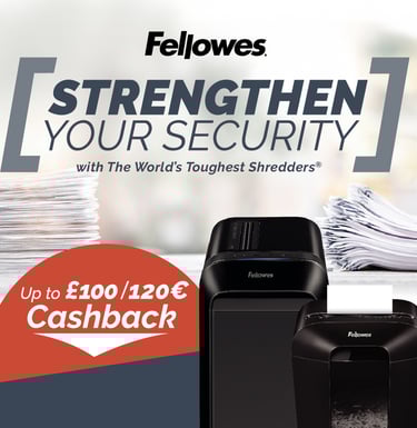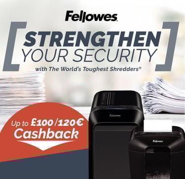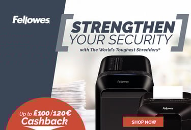 Your customers can claim up to £100/€120 Cashback on the best selling ranges of Fellowes Shredders, Binding and Laminating solutions.