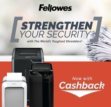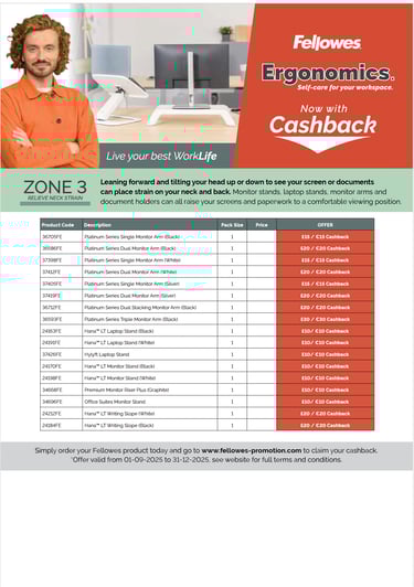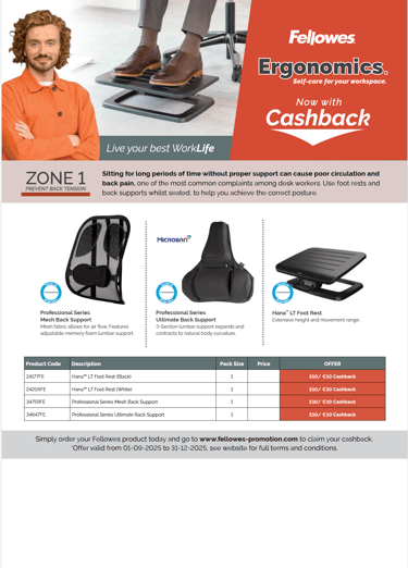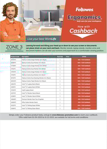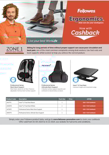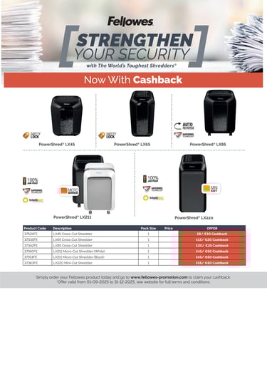 Your customers can claim up to £160/€200 Cashback on the best selling ranges of Fellowes Shredders and Ergonomic solutions.