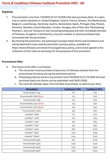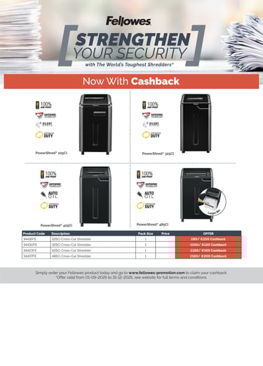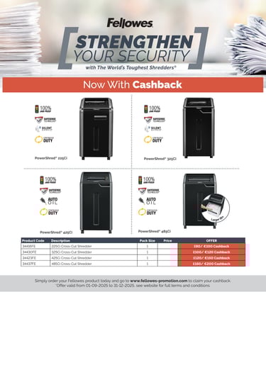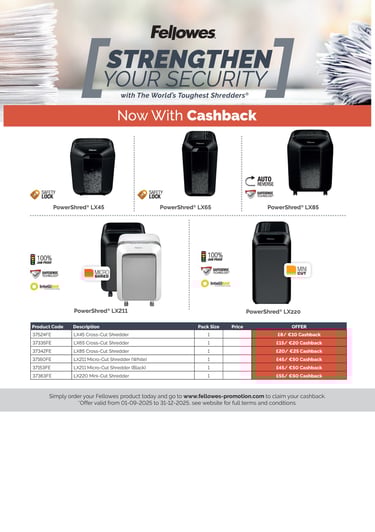 Promotions valid from 1st September to 31st December 2025. Cashback is claimed at www.fellowes-promotion.com. Please see website for Terms and Conditions.