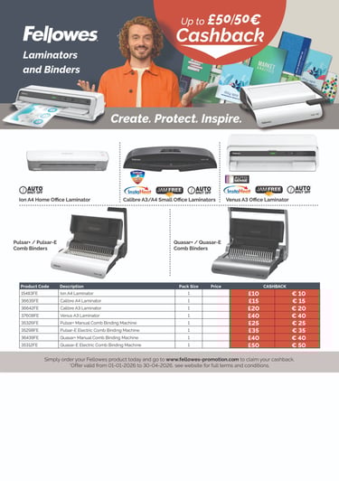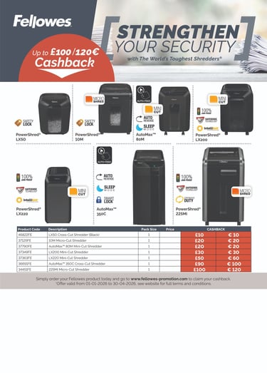 Promotions valid from 1st January to 30th April 2026. Cashback is claimed at www.fellowes-promotion.com. Please see website for Terms and Conditions.