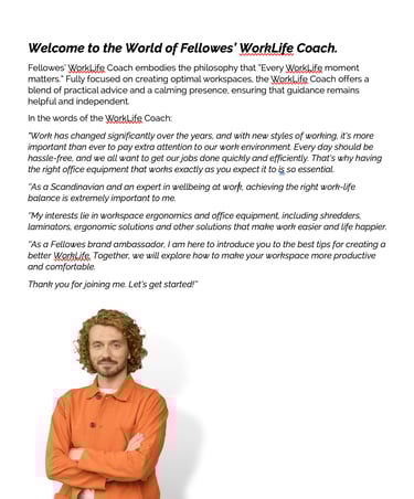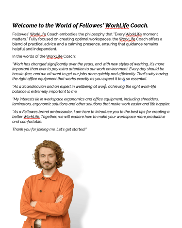 Fellowes’ WorkLife Coach embodies the philosophy that "Every WorkLife moment matters.” Fully focused on creating optimal workspaces, the WorkLife Coach offers a blend of practical advice and a calming presence, ensuring that guidance remains helpful and independent.